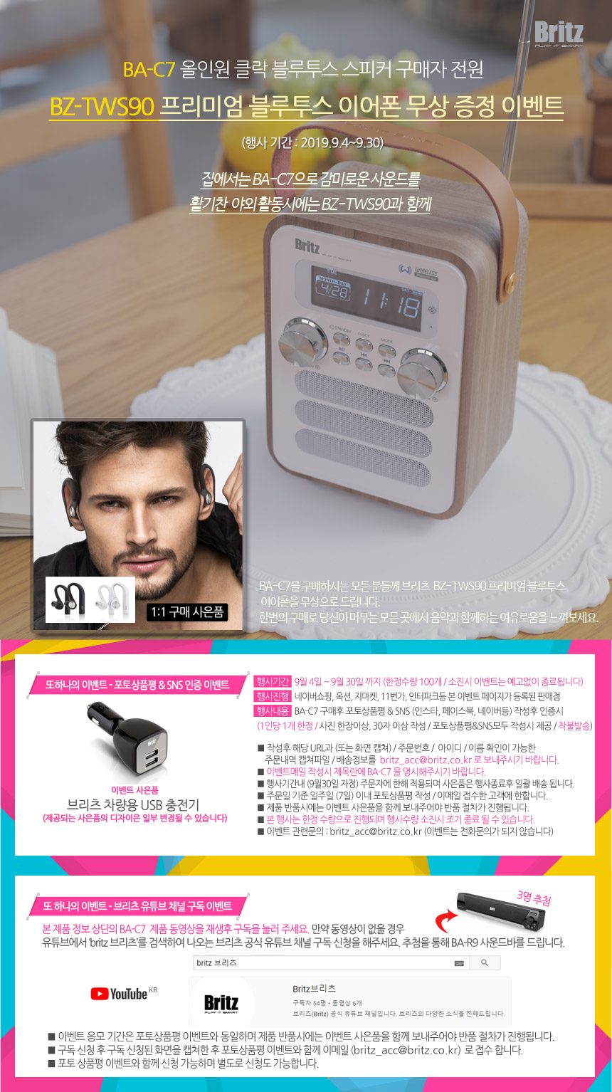 브리츠 BA-C7을 구매하시는 모든 분들께 브리츠 BZ-TWS90 블루투스 이어폰을 증정합니다.