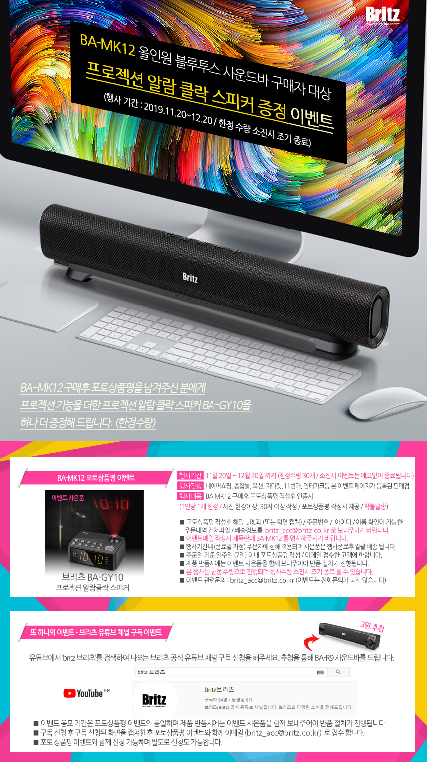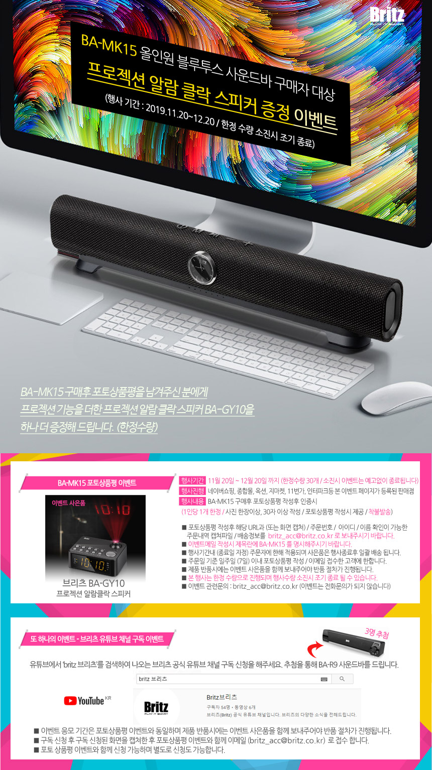 한편 브리츠는 ‘BA-MK12’와 ‘BA-MK15’ 구매자 대상으로 11월20일부터 내달 20일까지 약 한 달간 프로젝션 알람 시계 스피커 ‘BA-GY10’ 증정 이벤트를 연다. 참여방법은 간단하다. 네이버 쇼핑, 종합몰, 옥션, 지마켓, 11번가, 인터파크 등 이벤트 페이지가 등록된 판매점에서 구매 후 포토상품평을 작성하고, 브리츠 공식 유튜브 채널(http://bit.ly/2U2HZ5G)을 구독한다. 이벤트 페이지 내 안내된 이메일 주소로 이를 확인할 수 있는 내역과 함께 접수하면 정상 응모된다.