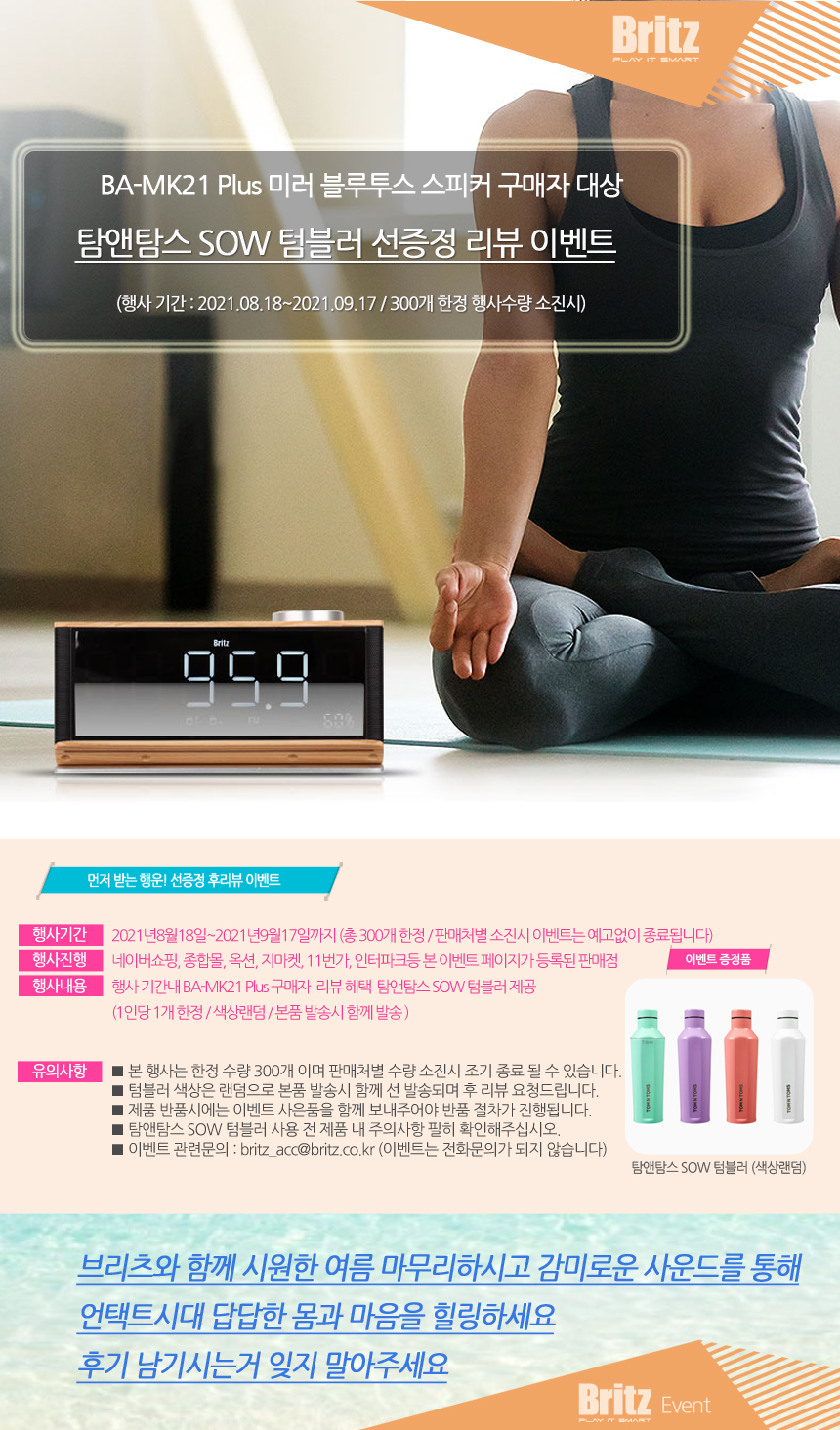 한편 브리츠는 ‘BA-MK21 Plus’ 구매자에게 ‘탐앤탐스 SOW 텀블러’ 선 증정 후 리뷰 이벤트를 진행한다. 행사 기간 내 한정 수량으로 진행되는 이번 행사는 사은품 수량 소진 시 조기종료 된다. 네이버 쇼핑, 종합몰, 옥션, 지마켓, 11번가, 인터파크 등 이벤트 페이지가 등록된 판매점에서 ‘BA-MK21 Plus’를 구매만 하면 된다.