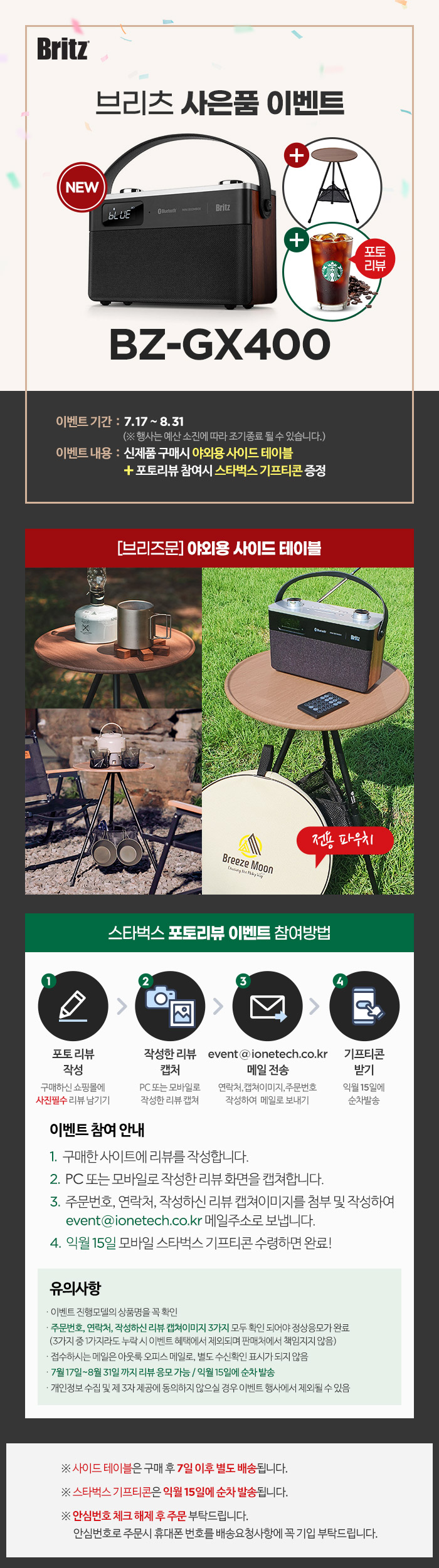한편 브리츠는 ‘BZ-GX400’ 사전예약 구매자에게 브리즈문 ‘사이드테이블’ 증정 이벤트를 진행한다. 한정 수량으로 진행되는 이번 행사는 사은품 수량 소진 시 조기종료 된다. 네이버 쇼핑, 종합몰, 옥션, 지마켓, 11번가, 인터파크 등 본 이벤트 페이지가 등록된 판매점에서 ‘BZ-GX400’을 구매만 하면 된다.