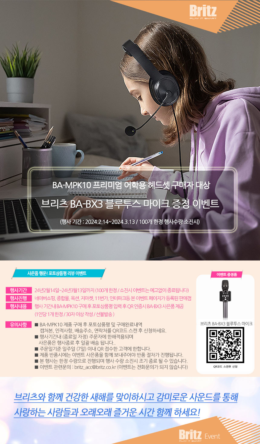 | BA-MPK10 프리미엄 어학용 헤드셋 구매시 BA-BX3 블루투스 마이크 증정 (0) | 2024.02.16 |