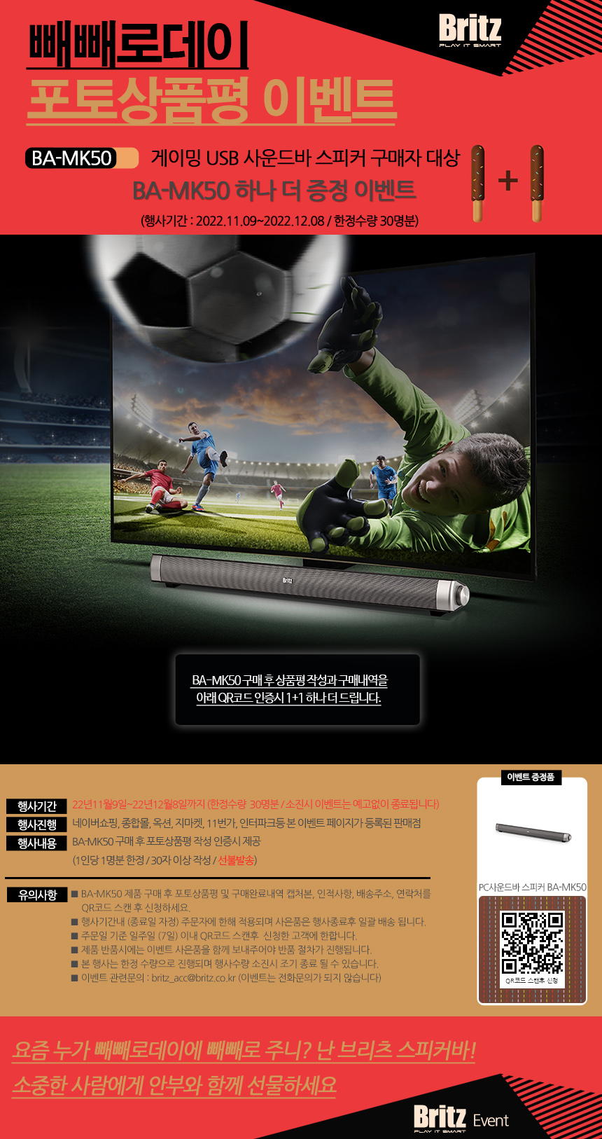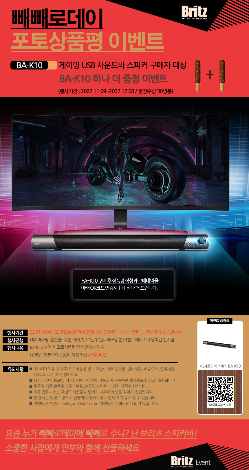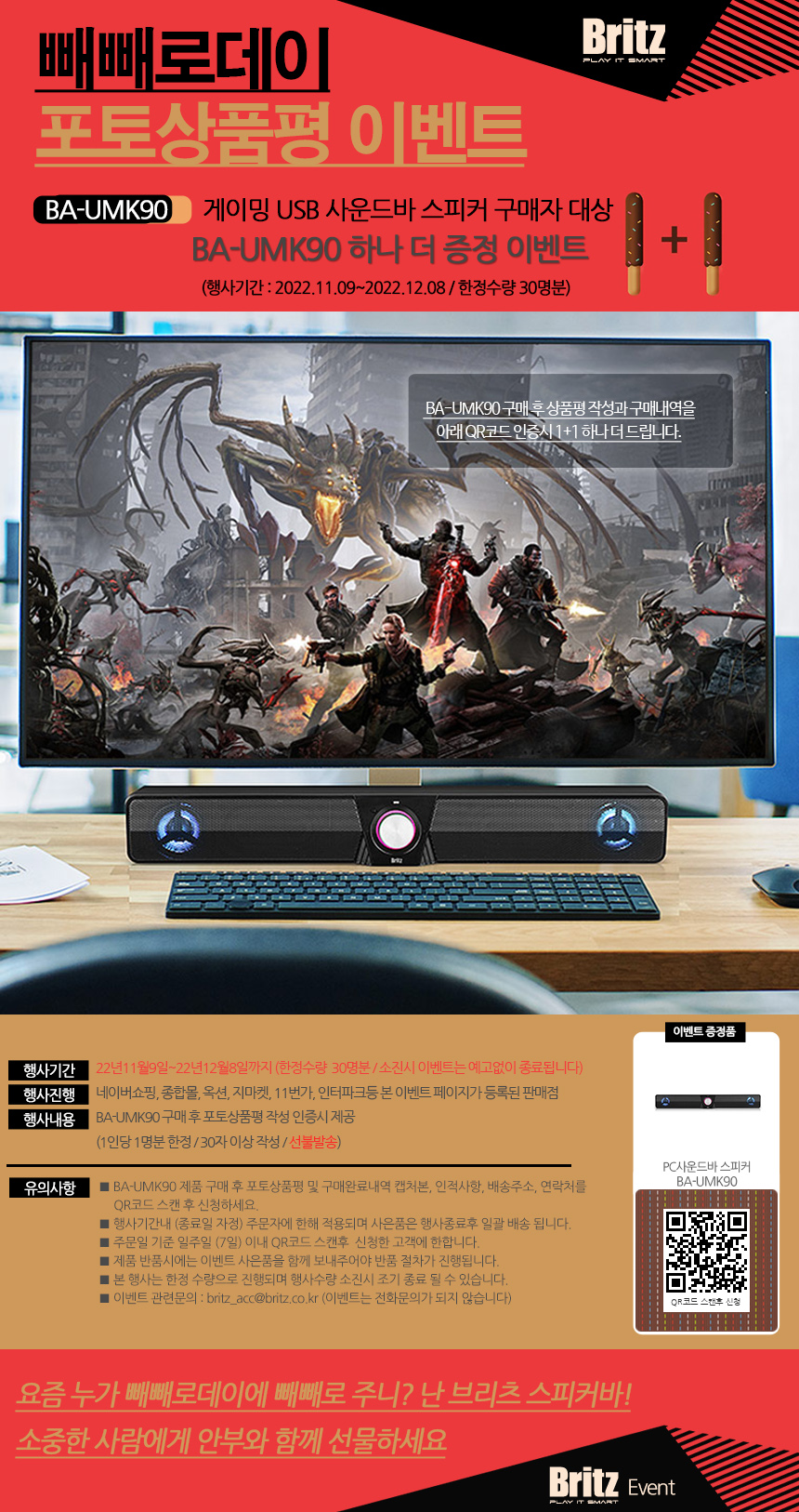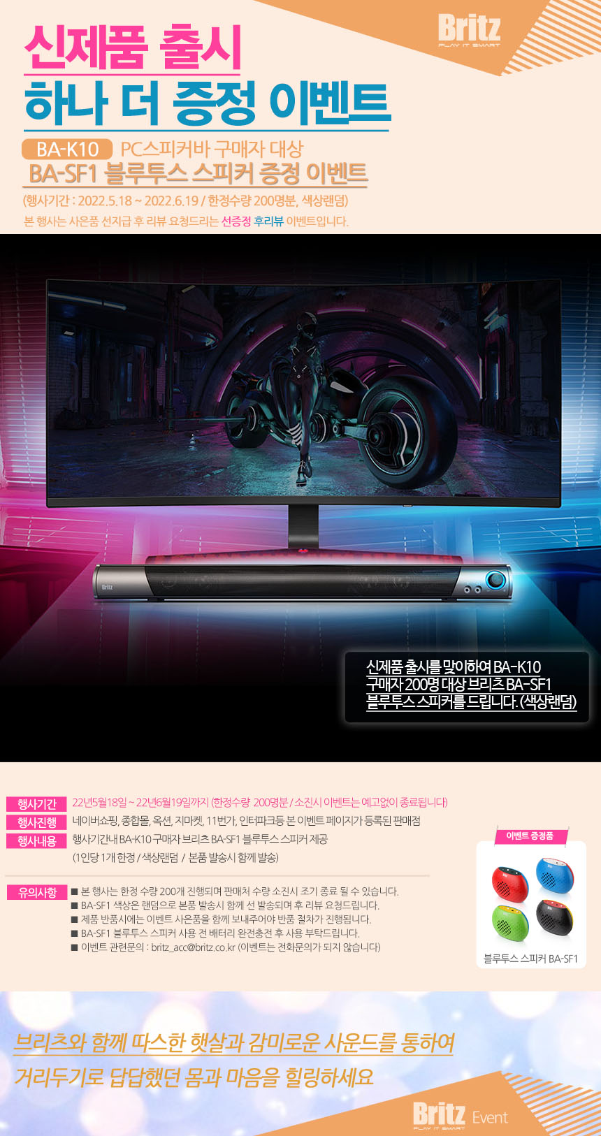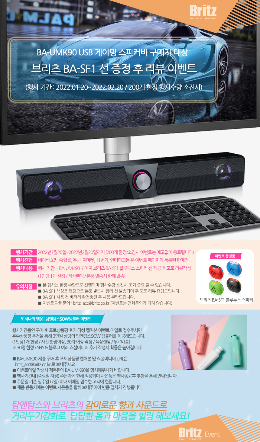 한편 브리츠는 ‘BA-R90 화이트에디션’ 구매후기 사은품으로 간단하게 한줄이상의 상품평을 작성하면 BA-SF1 블루투스 스피커 증정 이벤트를 실시한다. 행사 기간 내 한정 수량으로 진행되는 이번 행사는 사은품 수량 소진 시 조기종료 된다. 네이버 쇼핑, 종합몰, 옥션, 지마켓, 11번가, 인터파크 등 이벤트 페이지가 등록된 판매점에서 ‘BA-R90 화이트에디션’ 구매 후 포토상품평 작성 내용을 접수하면 된다.