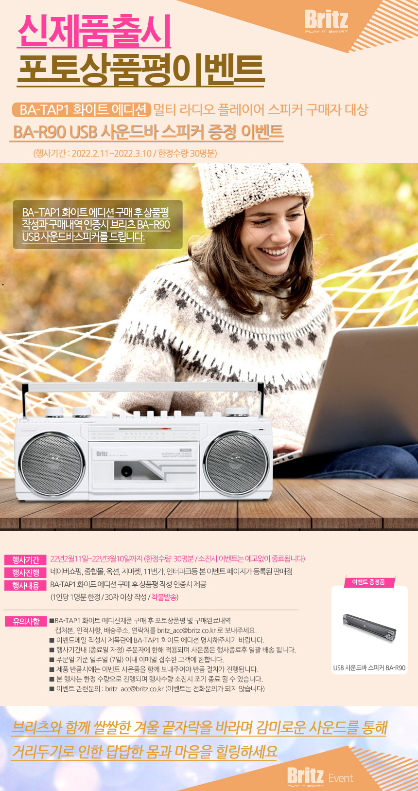 한편 브리츠는 ‘BA-TAP1 화이트에디션’ 구매자대상 포토후기 사은품으로 BA-R90 사운드바 증정 이벤트를 실시한다. 행사 기간 내 한정 수량으로 진행되는 이번 행사는 사은품 수량 소진 시 조기종료 된다. 네이버 쇼핑, 종합몰, 옥션, 지마켓, 11번가, 인터파크 등 이벤트 페이지가 등록된 판매점에서 ‘BA-TAP1 화이트에디션’ 구매 후 포토상품평 작성 내용을 접수하면 된다.