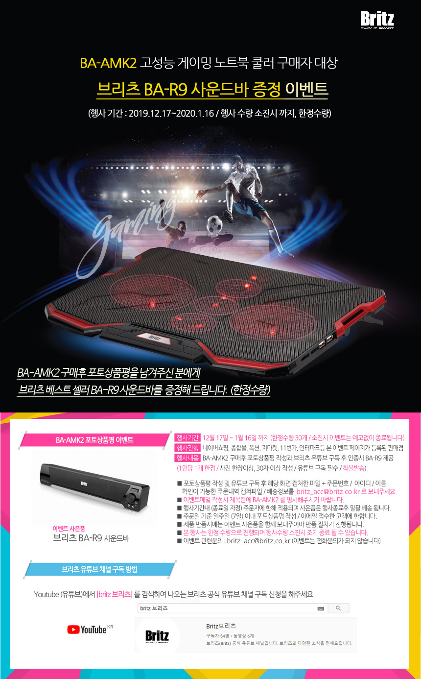오디오, 블루투스 스피커, 이어폰 등 생활밀착형 IT기기 전문기업 브리츠(http://britz.co.kr/)가 지능형 LED 5쿨링 패드 ‘BA-AMK2’를 선보이며, 구매자 한정 증정 이벤트를 연다.