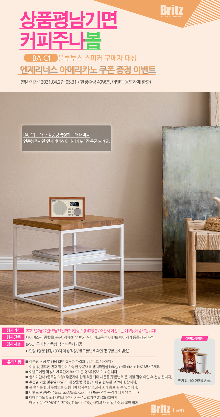 브리츠 제품을 구매하시고 시원한 소리를 들으시고 시원한 아메리카노도 받아가세요.