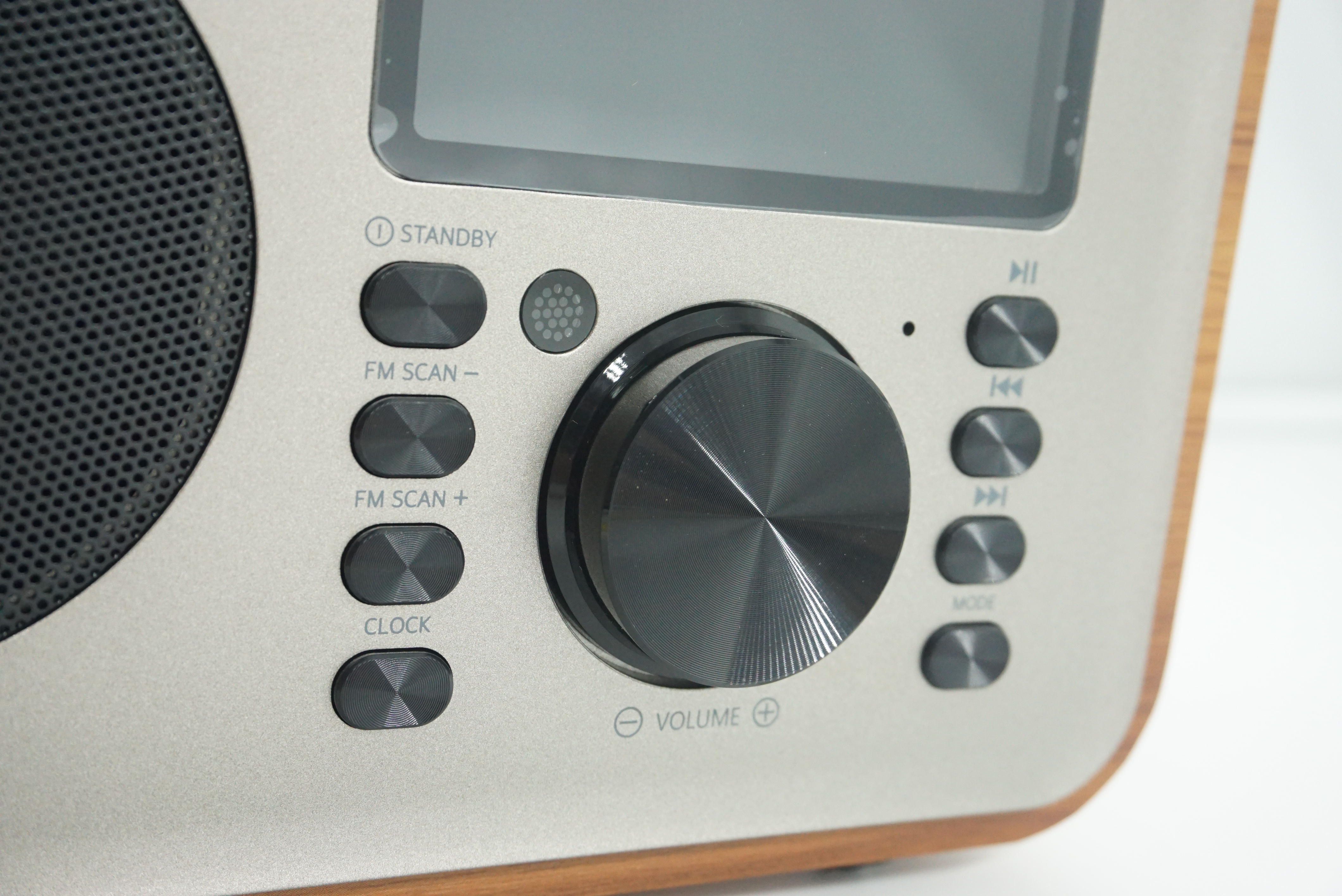 가운데 볼륨 조절 버튼을 중심으로 좌측은 전원,라디오 주파수 스캔과 시계 설정이며