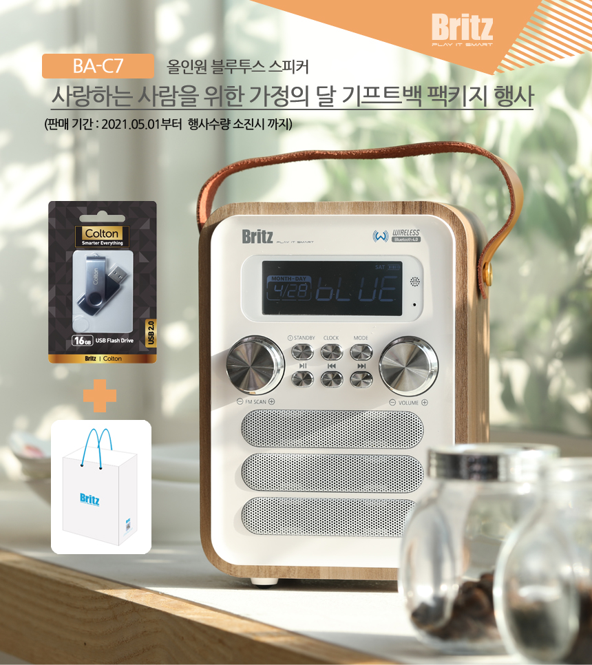 사운드 전문 기업 브리츠(www.britz.co.kr)는 브리츠의 인기 올인원 블루투스 스피커 BA-C7Colton 정품 16GB USB 외장 메모리와 기프트백을 무상으로 증정하는 가정의달 패키지 행사를 진행한다고 밝혔다.