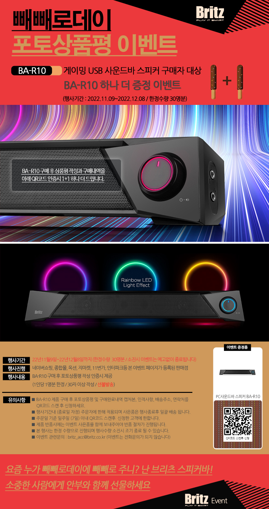 안녕하세요 빼빼로 데이 맞이 브리츠의 게이밍 사운드 바 4총사 즐거운 1+1 행사를 진행합니다.