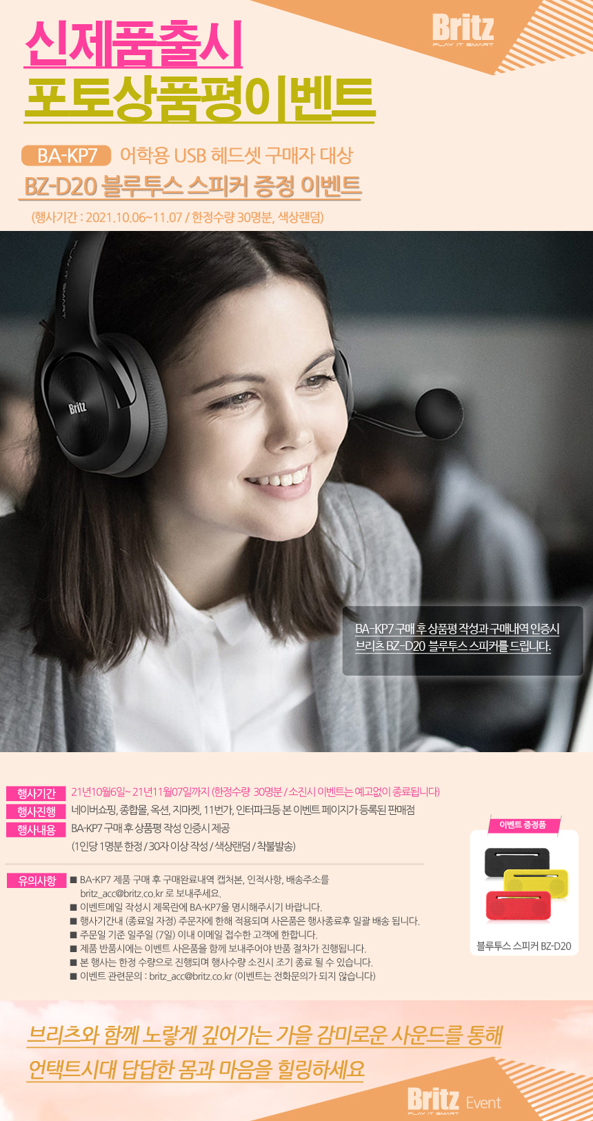 고품격 어학용 헤드셋 BA-KP7을 구매하시고 상품평을 남겨주시면 고급 스피커 BZ-D20을 드립니다.