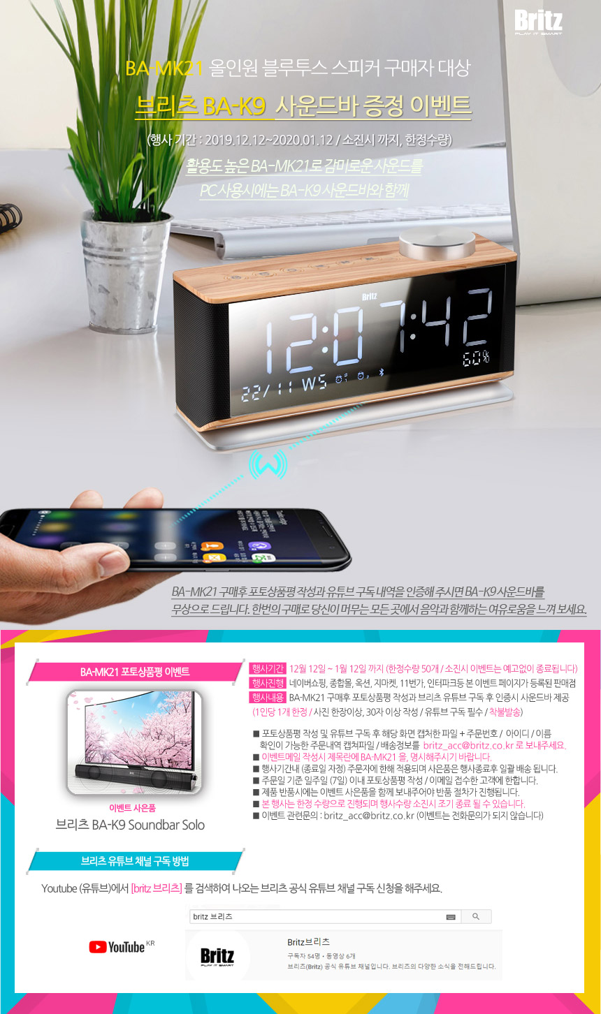 한편 브리츠는 ‘BA-MK21’ 구매자 대상으로 지난 24일부터 2020년 1월 27일까지 ‘BA-K9’ 사운드바 증정 이벤트를 진행한다. 참여방법은 네이버 쇼핑, 종합몰, 옥션, 지마켓, 11번가, 인터파크 등 이벤트 페이지가 등록된 판매점에서 구매 후 포토상품평을 작성하고, 브리츠 공식 유튜브 채널(http://bit.ly/2U2HZ5G)을 구독한다. 이벤트 페이지 내 안내된 이메일 주소로 이를 확인할 수 있는 내역과 함께 접수하면 정상 응모된다.
