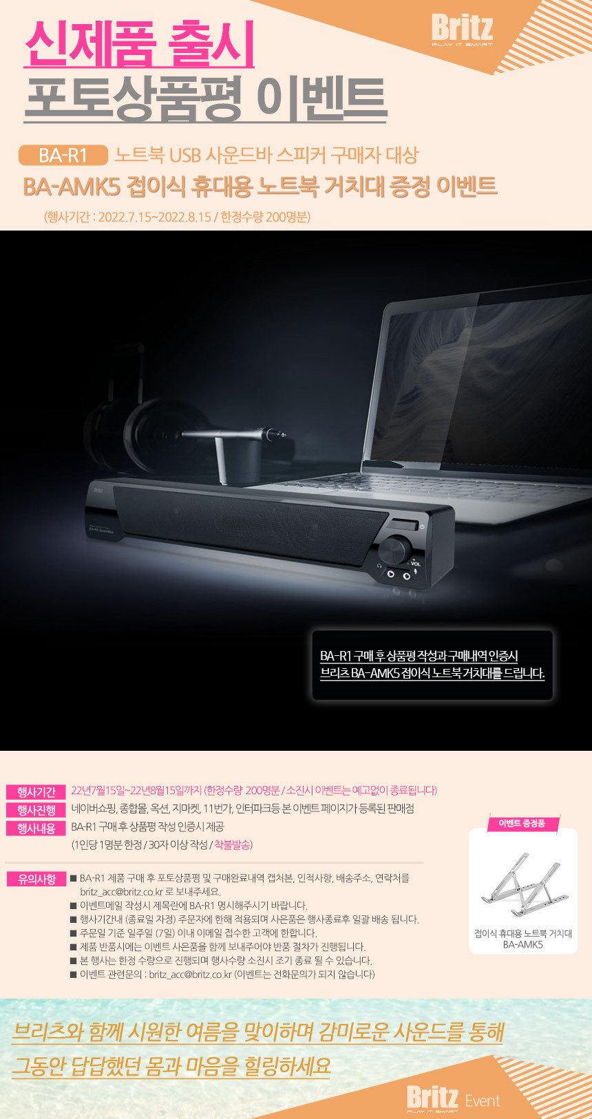 한편 브리츠는 ‘BA-R1 사운드바’ 구매자대상 포토후기 사은품으로 ‘BA-R1 사운드바 구매 시 BA-AMK5 접이식 휴대용 노트북 거치대 증정’ 이벤트를 실시한다. 행사 기간 내 한정 수량으로 진행되는 이번 행사는 사은품 수량 소진 시 조기종료 된다. 네이버 쇼핑, 종합몰, 옥션, 지마켓, 11번가, 인터파크 등 이벤트 페이지가 등록된 판매점에서 ‘BA-R1 사운드바’를 구매 후 포토상품평 작성 내용을 접수하면 된다.