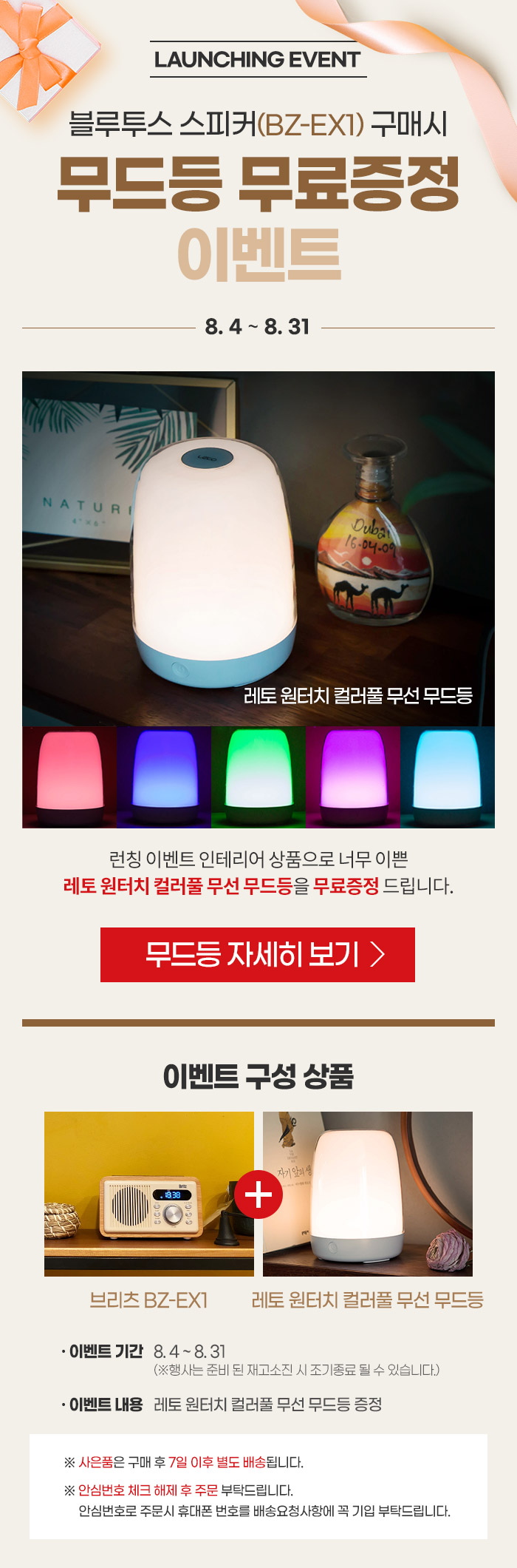 한편 브리츠는 ‘BZ-EX1’ 사전예약 구매자에게 레토 ‘원터치 컬러풀 무선 무드등’ 증정 이벤트를 진행한다. 한정 수량으로 진행되는 이번 행사는 사은품 수량 소진 시 조기종료 된다. 네이버 쇼핑, 종합몰, 옥션, 지마켓, 11번가, 인터파크 등 본 이벤트 페이지가 등록된 판매점에서 ‘BZ-EX1’을 구매만 하면 된다.