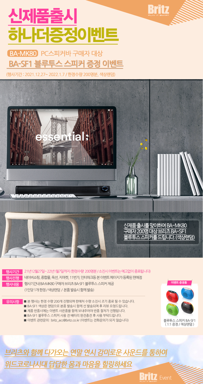 한편 브리츠는 ‘BA-MK80’ 사운드바 구매자에게 브리츠 블루투스 스피커 ‘BA-SF1’ 증정 이벤트를 진행한다. 한정 수량으로 진행되는 이번 행사는 사은품 수량 소진 시 조기종료 된다. 네이버 쇼핑, 종합몰, 옥션, 지마켓, 11번가, 인터파크 등 본 이벤트 페이지가 등록된 판매점에서 ‘BA-MK80’을 구매만 하면 된다.